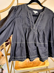 This black flowy top with contrasting white stitching offers a relaxed fit that’s perfect for any occasion. The split neckline beautifully showcases your favorite layered necklaces, adding a playful touch to your outfit. Pair it with jeans for a cute casual vibe or dress it up with pants for work or church. Versatile and effortlessly stylish, it’s a wardrobe must-have.