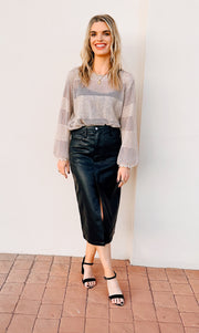 This faux leather pencil skirt hugs your curves with a stretchy fit that moves as you do. The front slit adds a flirty touch, letting you show off a little leg while keeping things sleek and stylish. Perfect for turning heads with a playful edge.