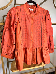 Elevate your fall wardrobe with this playful high neck blouse in a charming rust color. Crafted from soft cotton, it features a delicate eyelet pattern and classic button-down front, blending comfort with a touch of whimsy. Perfect for layering or wearing on its own, this blouse adds a fresh, stylish twist to your seasonal looks.