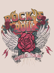 White shirt with screen printed graphic with Rock & Roll text and roe graphic