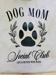 Light grey shirt with black screen printed graphic with Dog Mom Social Club text and dog paw graphic