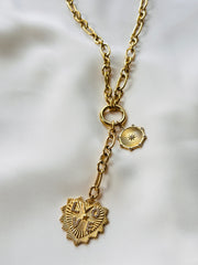 The circular push clasp in the front of the necklace is an easy way to take the necklace on and off. A small circle pendant is adorned on the push clasp. But the charm can also be removed for a new look.